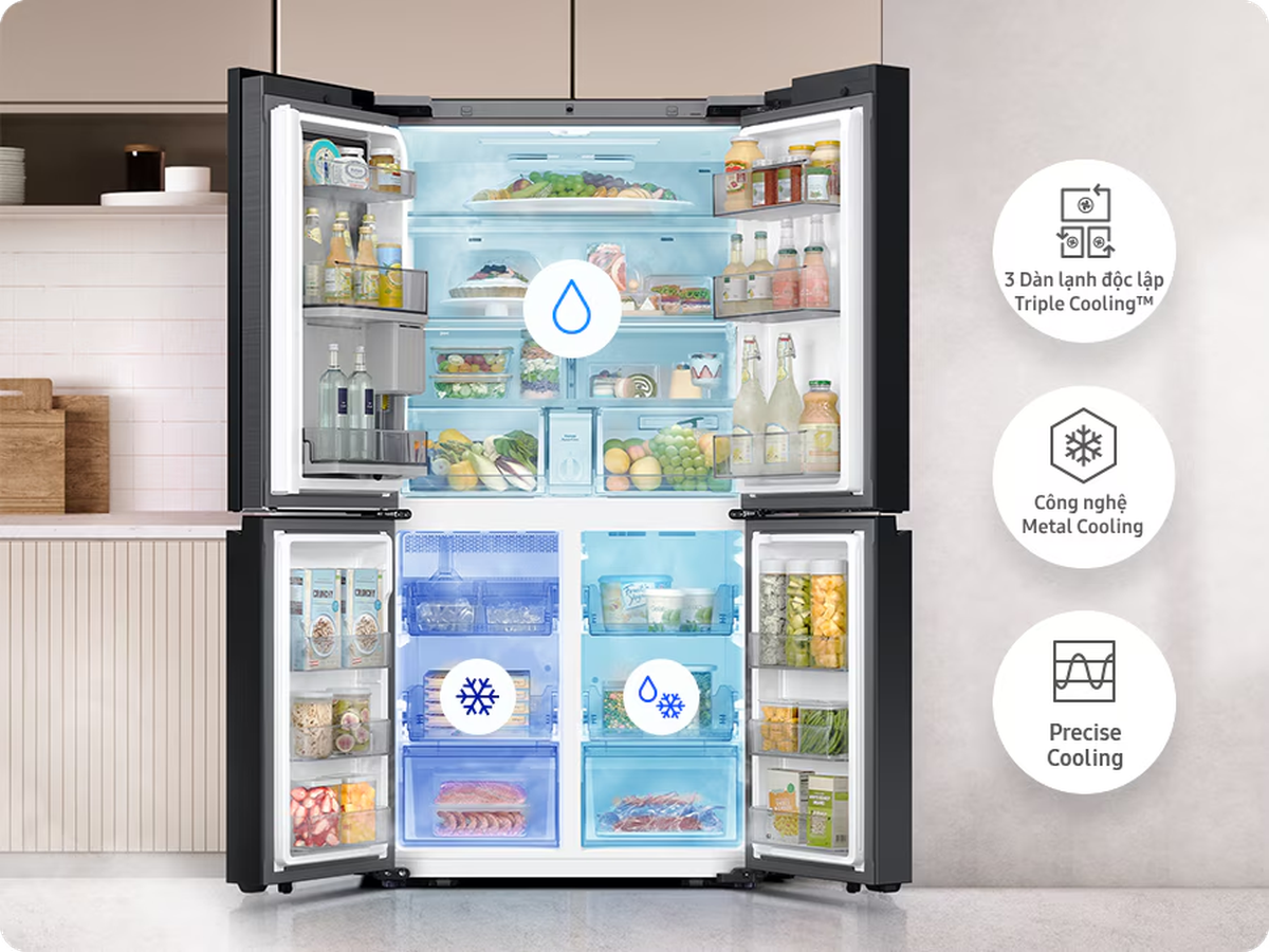 Samsung Bespoke AI Family Hub™+ sở hữu công nghệ bảo quản thực phẩm hàng đầu, xứng tầm chuyên gia bảo quản thực phẩm tươi ngon như công nghệ Triple Cooling với 3 dàn lạnh độc lập cung cấp khí lạnh riêng biệt cho 3 ngăn tủ. Điều này giúp duy trì nhiệt độ và độ ẩm tối ưu trong từng ngăn, đảm bảo thực phẩm tươi ngon mà không bị lẫn mùi.